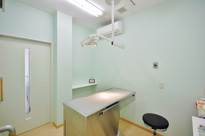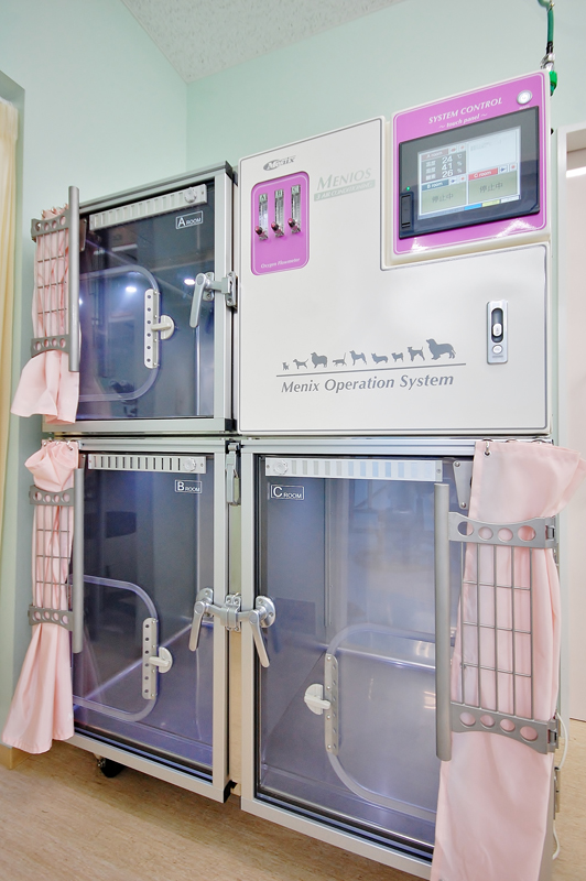 重症の動物のための集中治療室も完備しております。常に獣医師の目が届く処置室に配置しておりますので安心です。